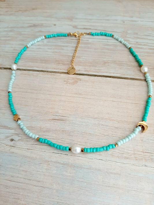 Collier choker "AZUR" - perles et acier inoxydable doré