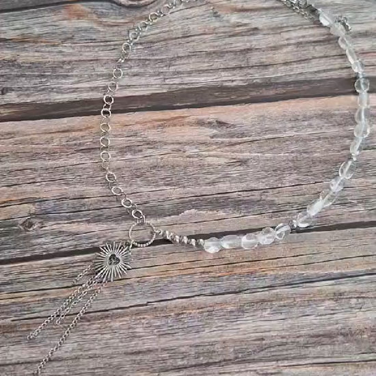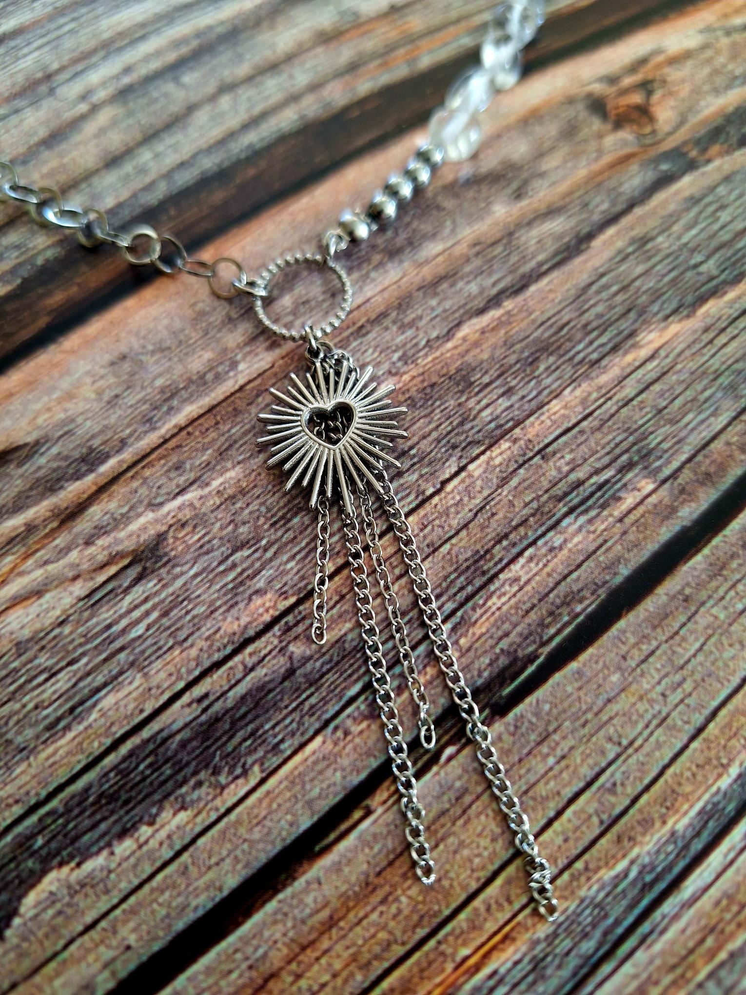 Il est ponctué de perles d'hématite argentées et d'un pendentif "coeur/soleil", suspendu à une chaîne à maillons fantaisie ronds.
