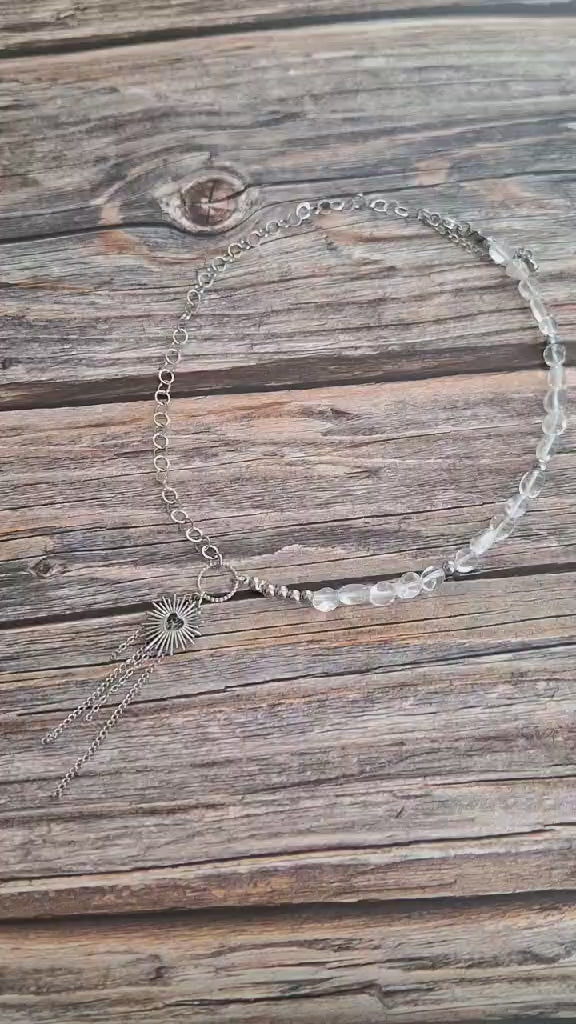 Un collier lumineux composé de perles en cristal de roche, symbole de clarté et d'harmonie.