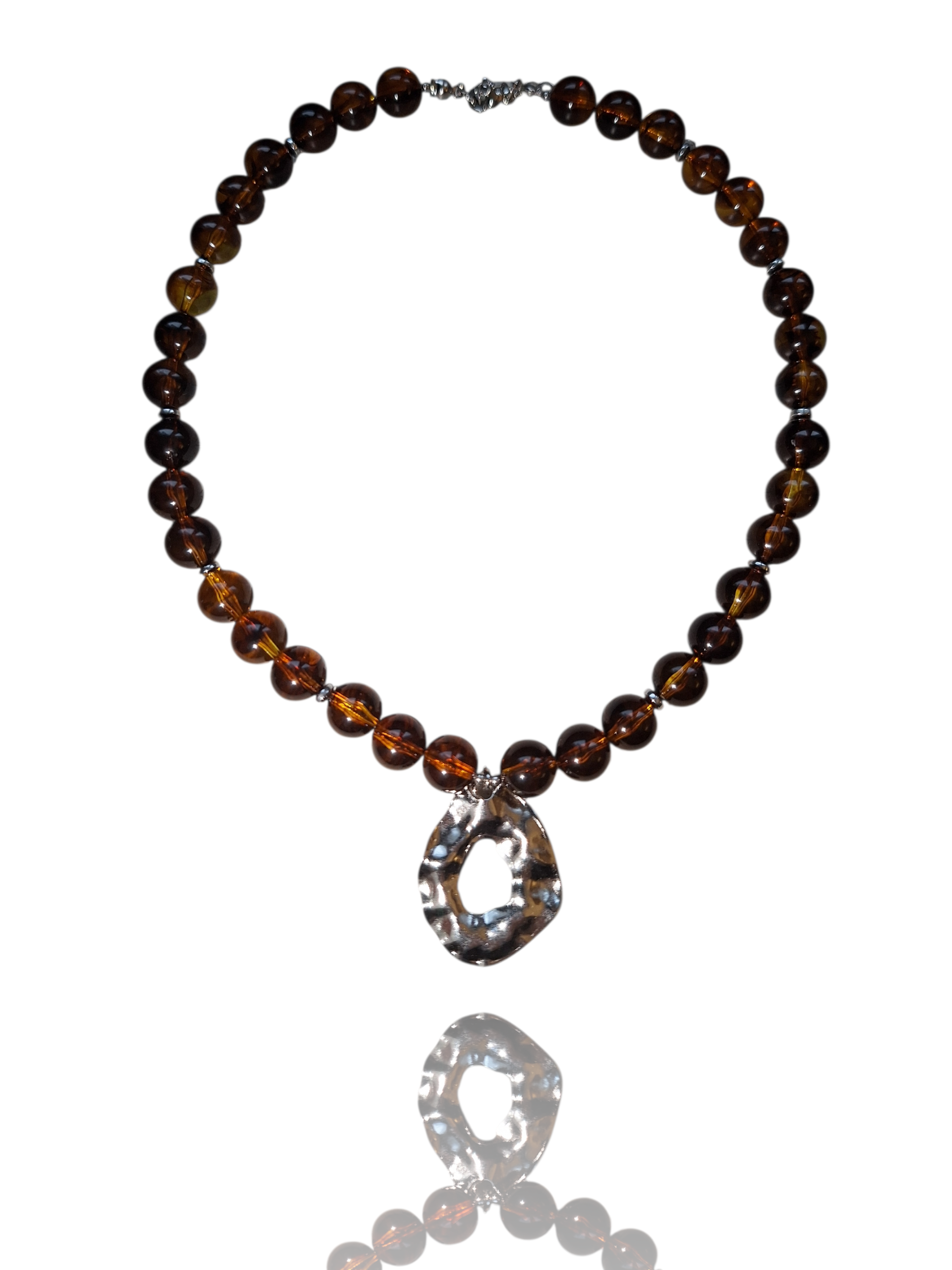 Composé de perles ambre marbrées aux nuances cuivrées, il évoque les jeux de lumière du désert au crépuscule.