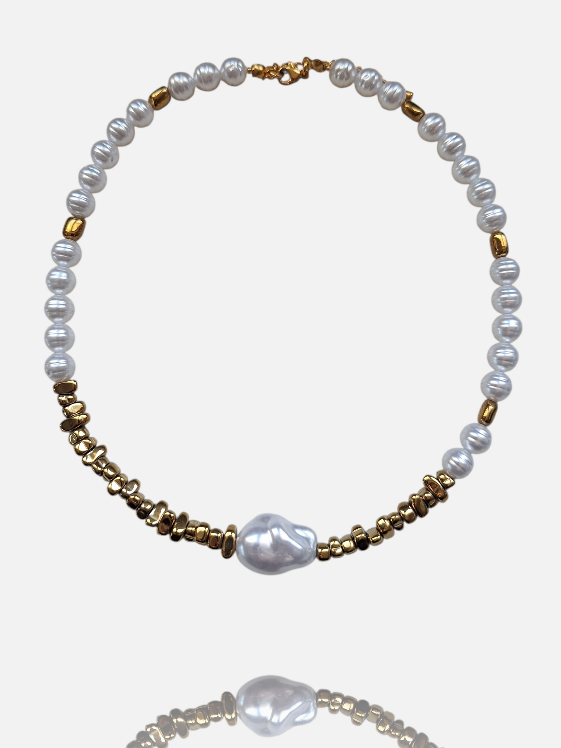 Composé de perles imitation d'eau douce au lustre délicat et de perles chips en hématite, il joue sur le contraste entre la lumière nacrée et l'éclat minéral.