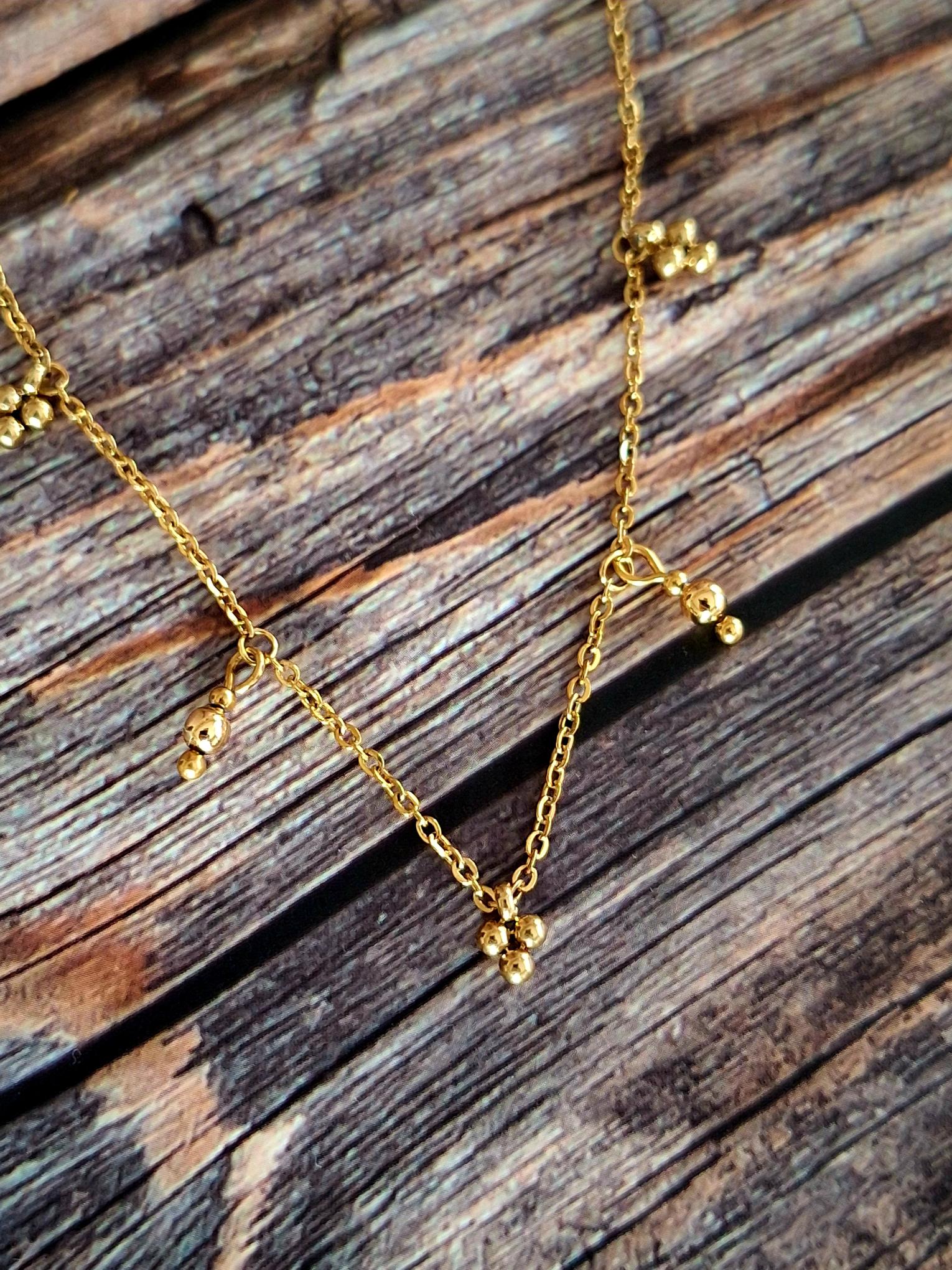 Sa chaîne délicate est ponctuée de mini perles et de mini breloques composées de 3 boules suspendues comme des éclats de lumière.